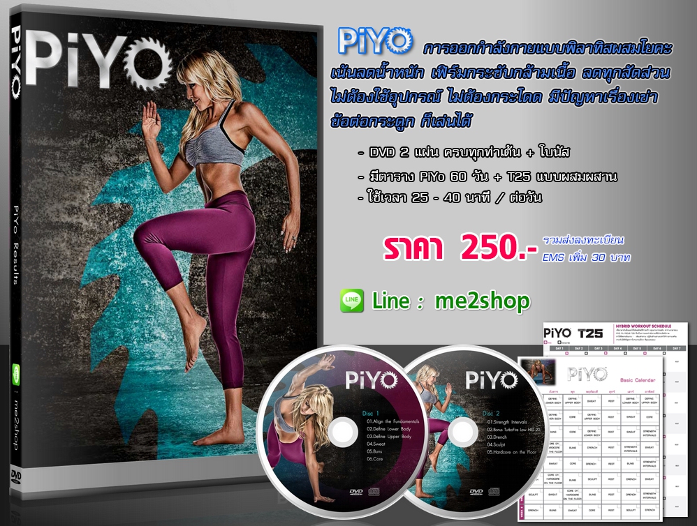 โปรแกรมออกกำลังกาย Piyo เน้นทุกส่วนของร่างกาย เป็นการออกกำลังกายที่ผสมผสานระหว่างพิลาเทส์กับโยคะ ไม่ต้องใช้อุปกรณ์ใดๆ